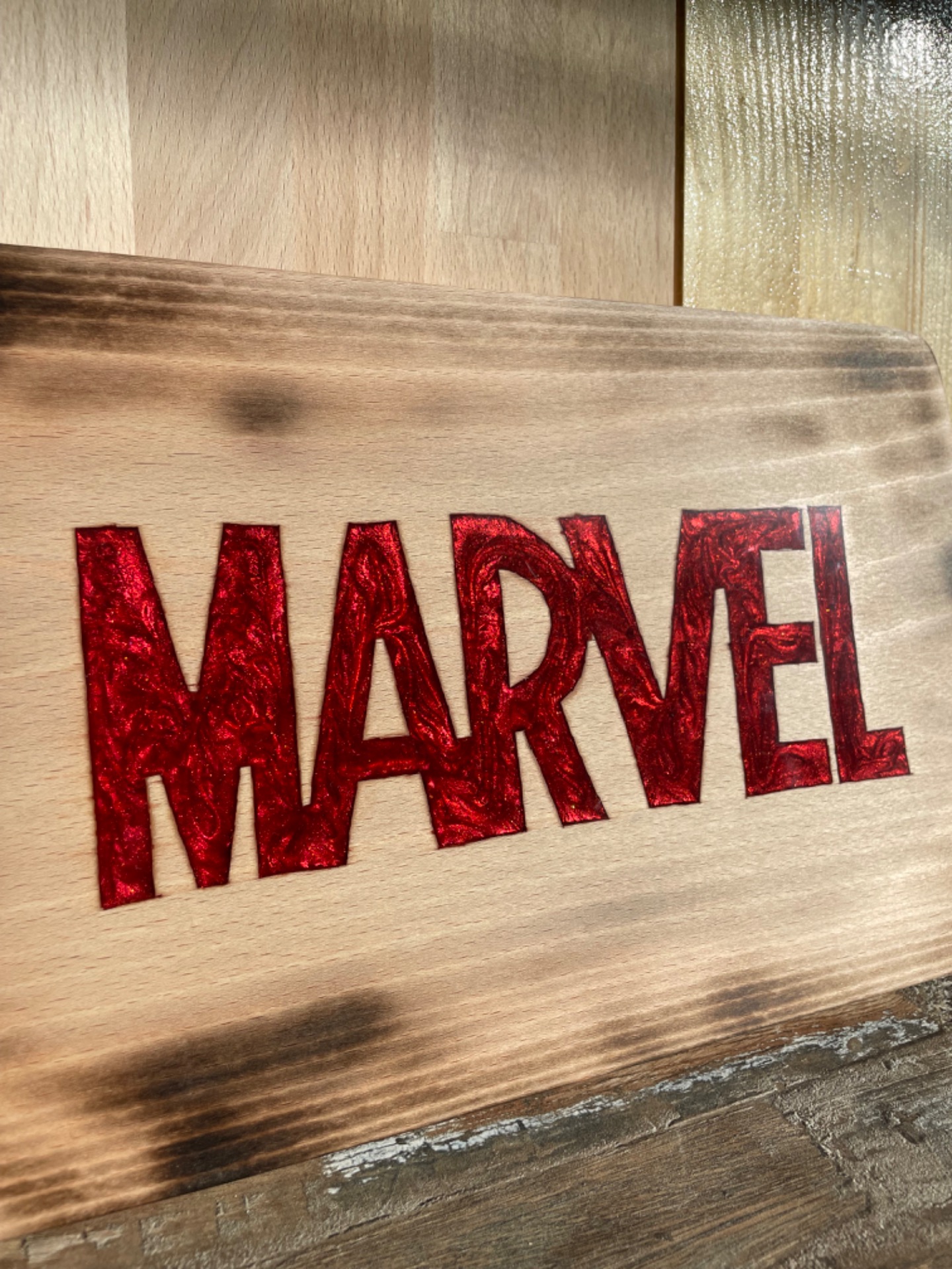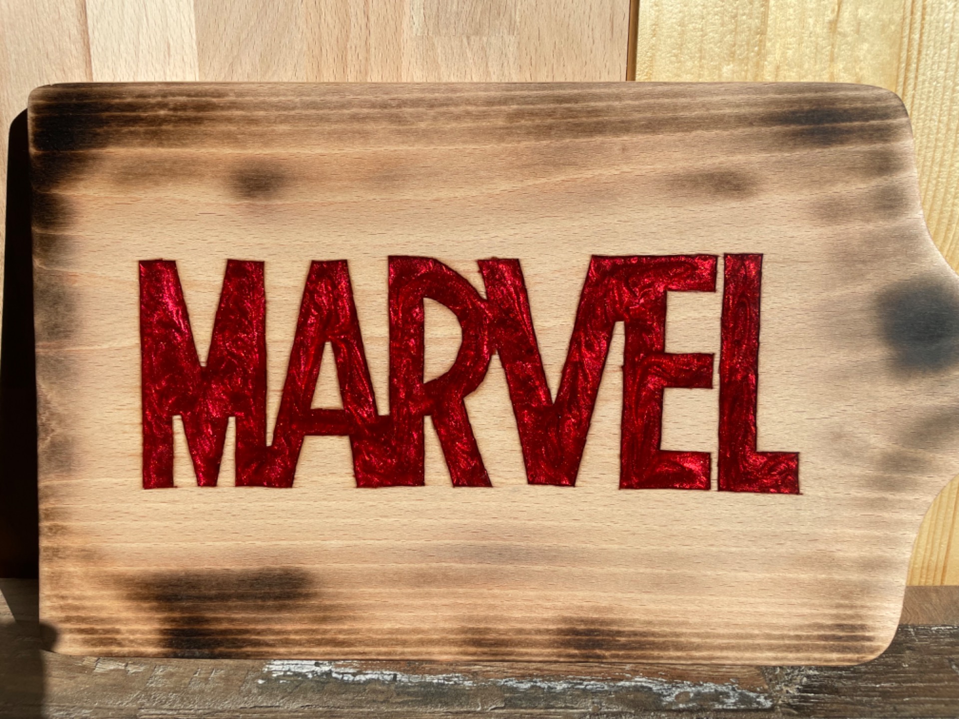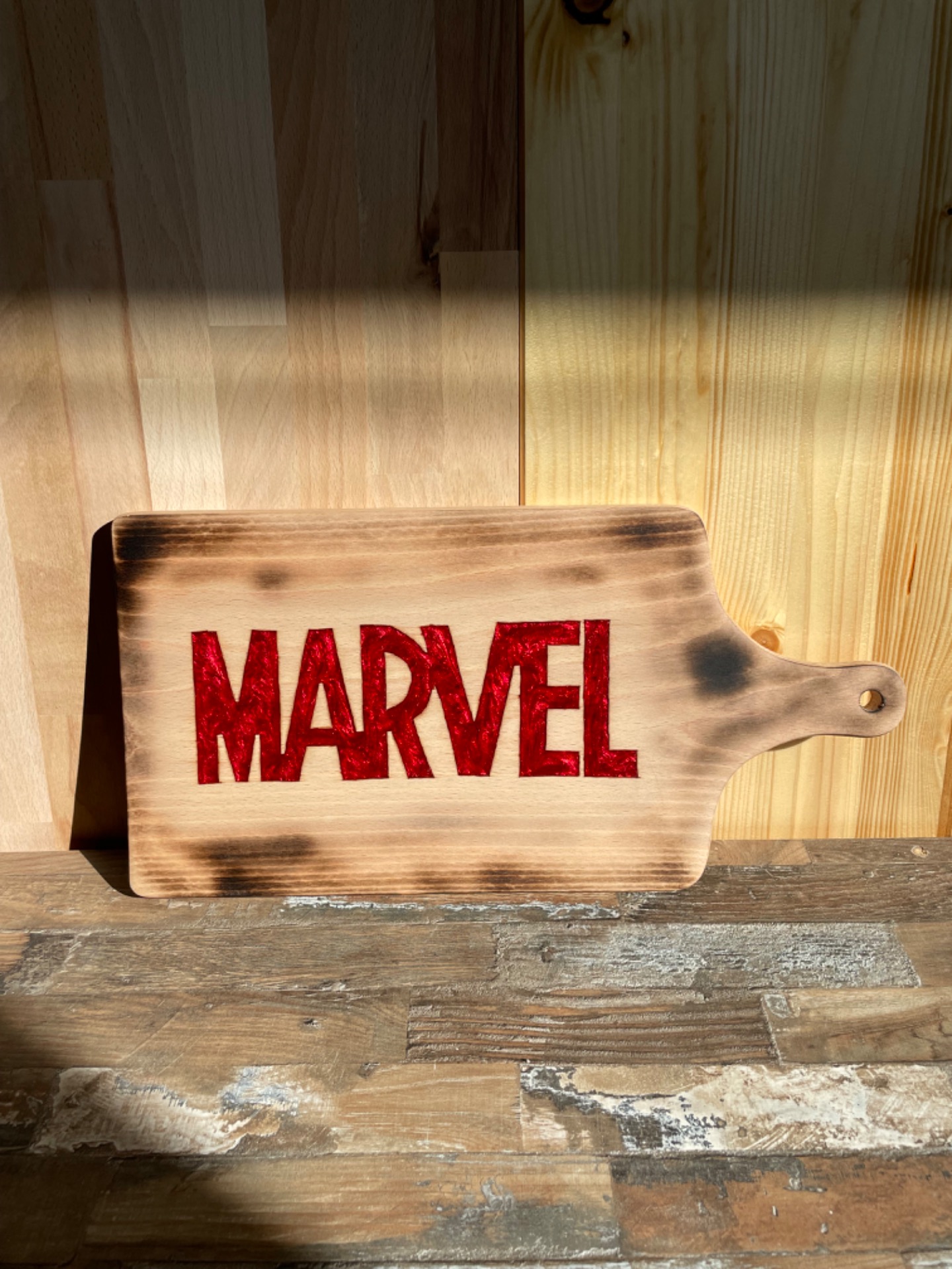 Predstavujeme jedinečný drevený podnos na jedlo so starostlivo ručne vyrezávaným nápisom "MARVEL", zaliaty epoxidovou živicou s podmanivým metalickým červeným pigmentom.